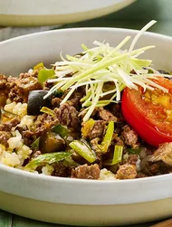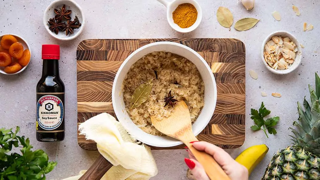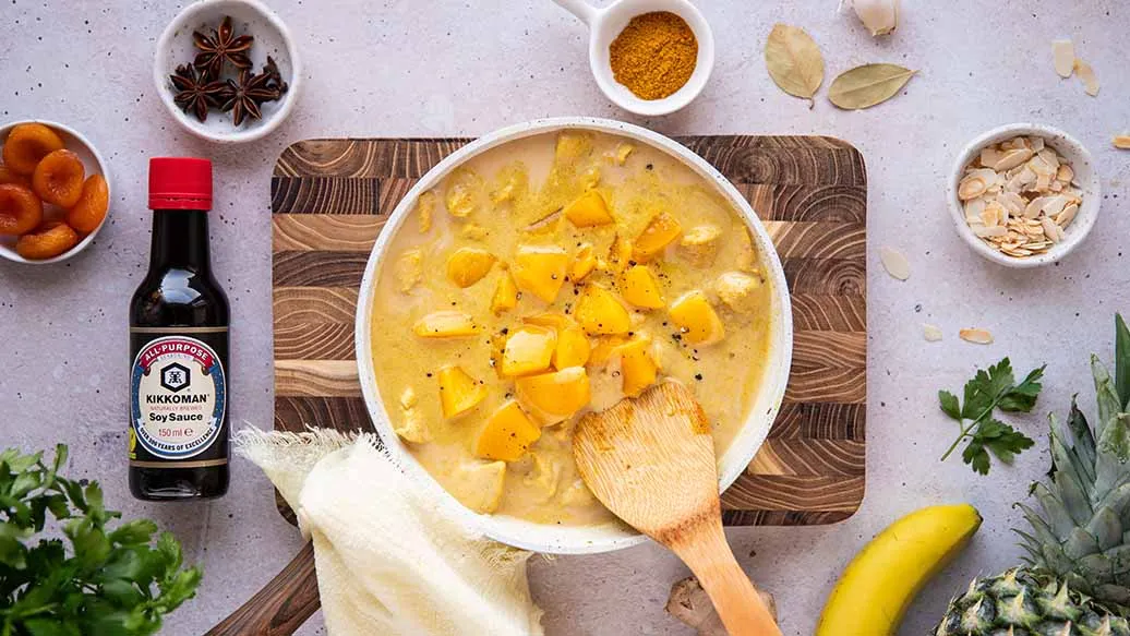 Le Riz Casimir marie du poulet fondant, des épices curry douces et des fruits délicatement sucrés. Une touche de sauce soja Kikkoman vient relever le tout avec profondeur et umami. Servi chaud, c’est un plat réconfortant, complet et plein de saveurs.