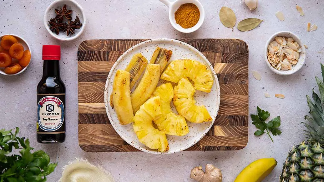 Couper la banane en deux dans le sens de la largeur, puis dans le sens de la longueur. Éplucher l'ananas. Retirer et jeter le cœur dur. Couper votre ananas en rondelles d'environ 1,5 cm d'épaisseur, puis couper chaque rondelle en deux. Faire fondre le beurre dans une poêle et faire revenir les fruits brièvement des deux côtés jusqu'à ce qu'ils soient légèrement dorés. Les transférer dans une assiette et réserver au chaud.