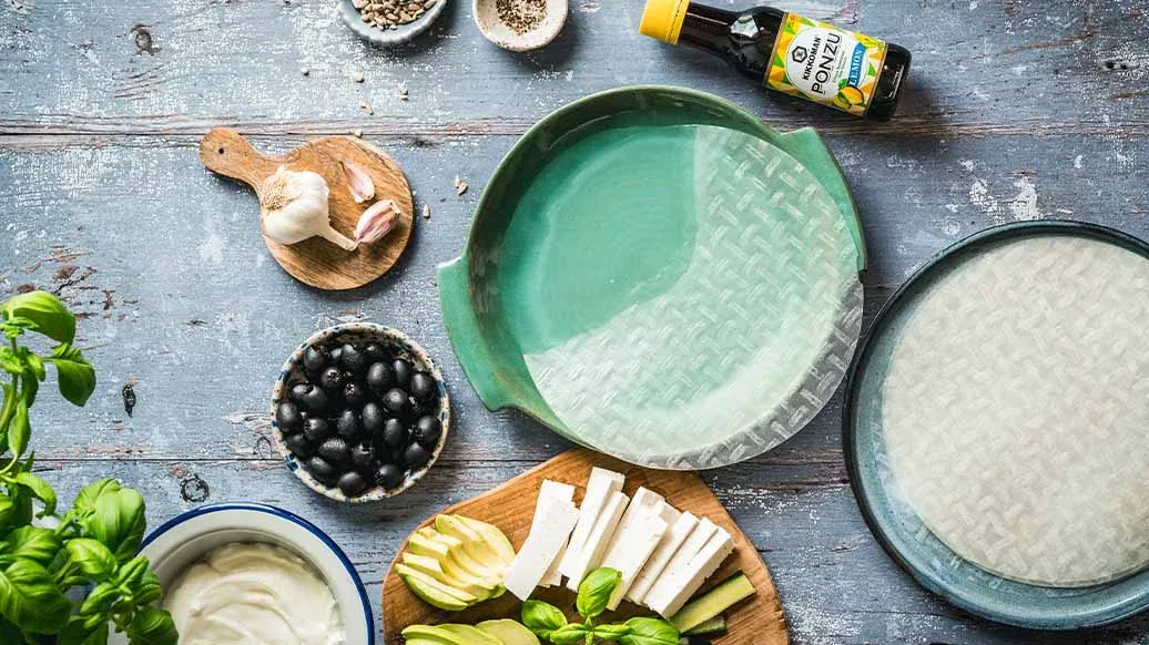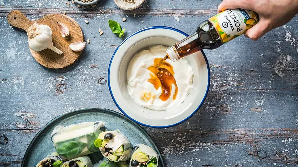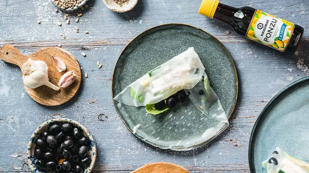 Des rouleaux d’été méditerranéens et entièrement végétariens. Fourrés avec des olives et de la feta et servis avec une sauce au yaourt et à la sauce soja citronnée Ponzu Kikkoman. Idéals pour un déjeuner d’été.
