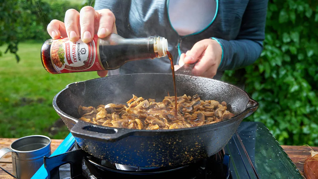 Émincer les champignons et l'oignon, puis les faire revenir dans l'huile de colza. Ajouter la marinade Teriyaki Kikkoman et laisser cuire jusqu'à ce que la majeure partie du liquide se soit évaporée.