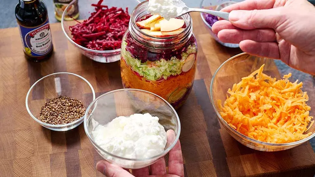 Disposer la salade en couches dans un grand verre à salade comme suit : vinaigrette, chou rouge, pomme, carotte, radis, chou pointu, betterave, poire, fromage frais et graines de lin. Fermer le bocal et le secouer brièvement avant de servir pour bien repartir la vinaigrette. Vous pouvez également servir la salade dans des bols.
