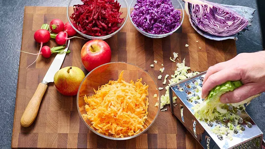 Râper grossièrement le chou pointu, le chou rouge, les betteraves et les carottes séparément. Émincer les radis, puis couper la pomme et la poire en quartiers, puis en tranches.