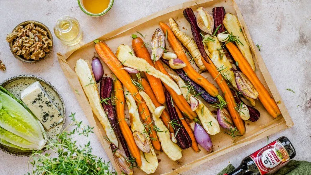 Pour la salade, vous pouvez également utiliser des carottes multicolores, de la betterave ou de la scorsonère noire et les rôtir en même temps que les autres légumes.