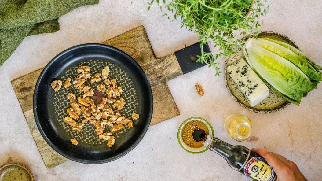 70 g de noix – 2 càs de miel – 2 càs Sauce soja fermentation naturelle Kikkoman – 2 pincée poivre