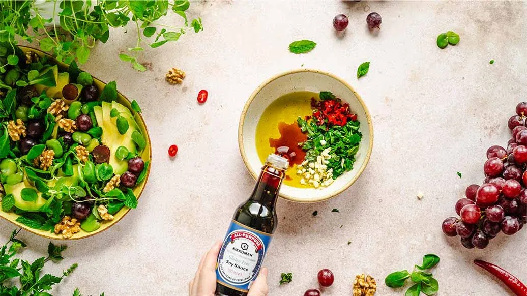 Hacher finement l’ail, le piment et les herbes. Les mélanger avec l’huile d’olive, la sauce soja et le vinaigre de cidre. Verser la sauce chimichurri sur la salade.