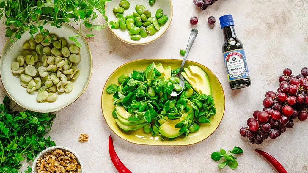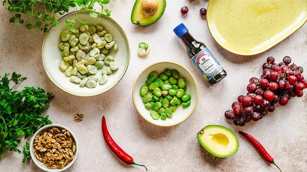Dans un saladier, mélanger l’avocat, les fèves, les raisins, les noix, la mâche et les herbes.