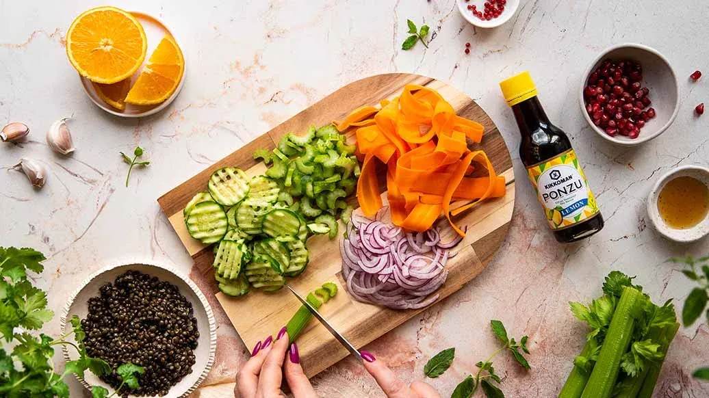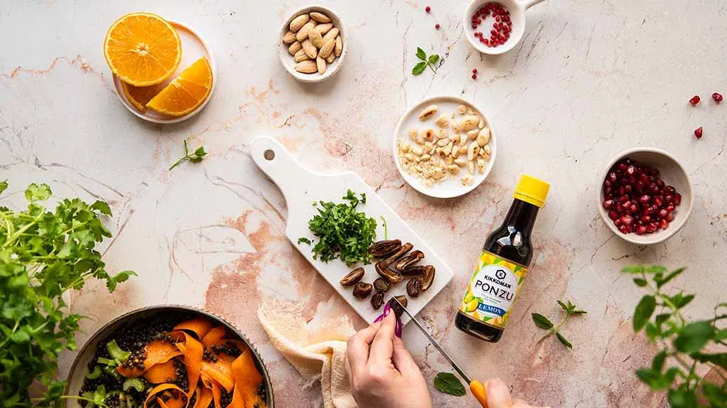 Légère et savoureuse, cette salade marocaine associe lentilles noires, légumes croquants, dattes et herbes fraîches. Une sauce Ponzu Kikkoman au citron vient relever le tout. Parfaite en entrée ou en accompagnement.