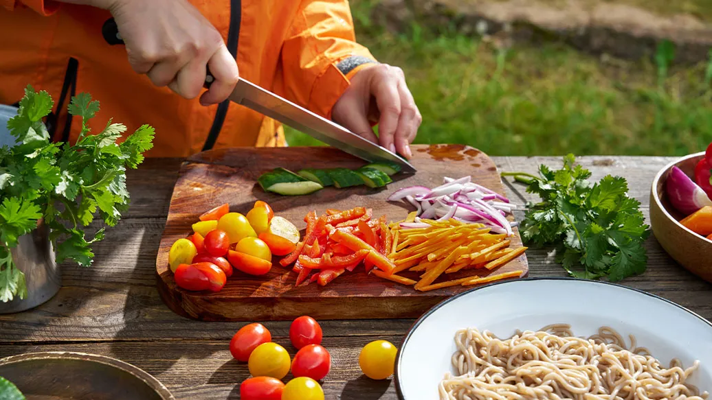 200 g de nouilles soba – 80 g de carottes – 100 g de concombre – 100 g de poivron rouge – ½ oignon rouge