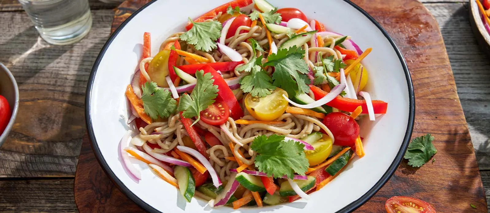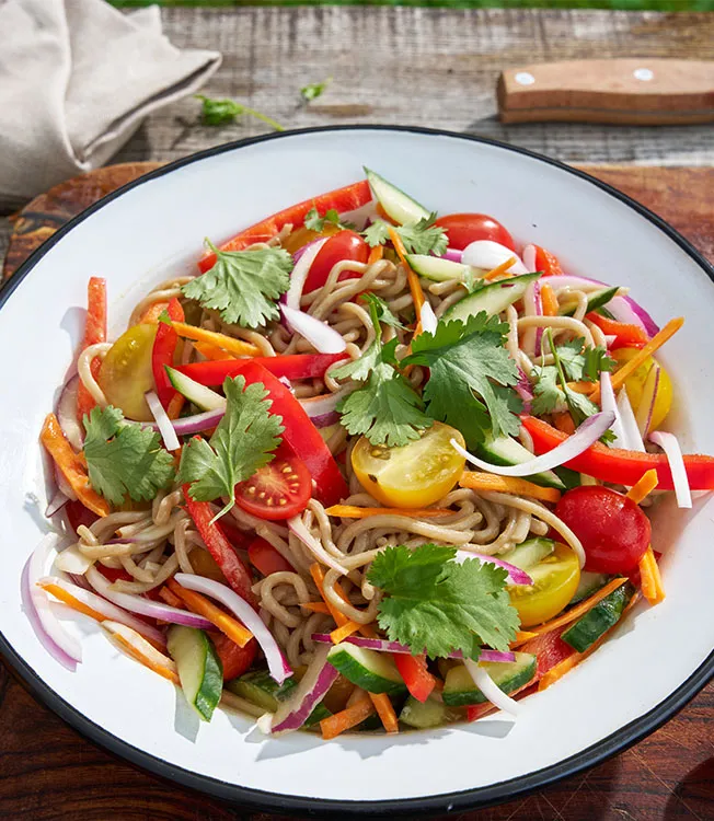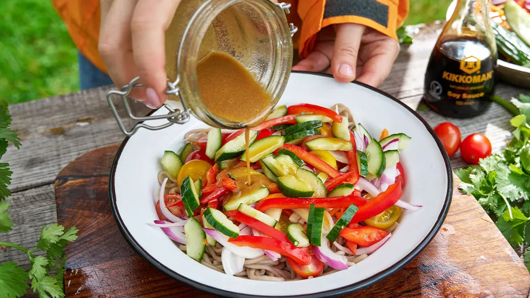 Nouilles soba accompagnées de légumes croquants et d’une sauce aromatique à base de sauce soja Kikkoman et de tahini. Une salade légère et rafraîchissante, idéale pour le déjeuner.