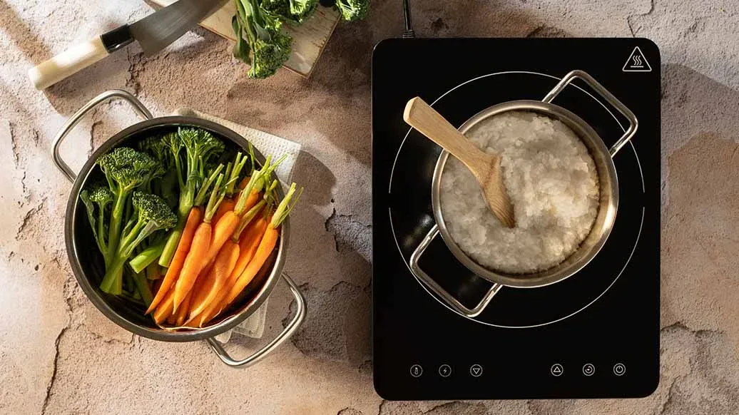 200 g de riz gluant – 400 ml d'eau – 150 g de brocoli, coupé en bouquets et cuit à la vapeur ou blanchi – 150 g de carottes, coupées en bâtonnets, cuites à la vapeur ou blanchies