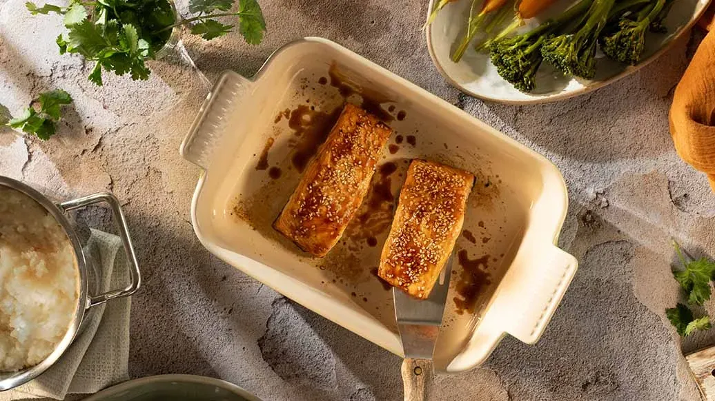 Une délicieuse recette de pavé de saumon rôti au four avec une sauce au soja et sésame sucrée. À déguster avec du riz gluant et des légumes croquants pour un sans-faute.