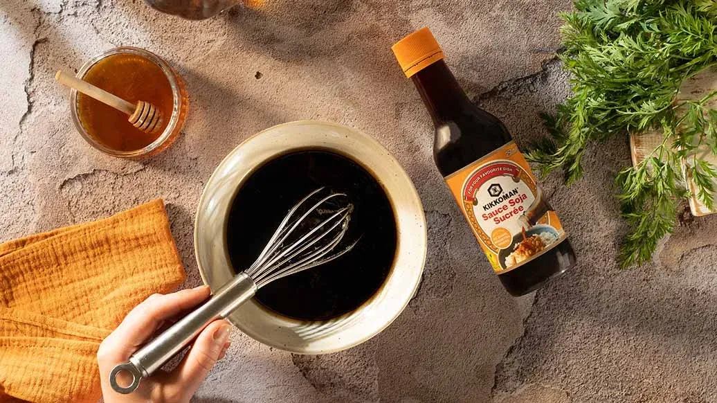 80 ml Sauce soja sucrée Kikkoman – 1 càs Huile de sésame grillée Kikkoman – 2 càs de miel