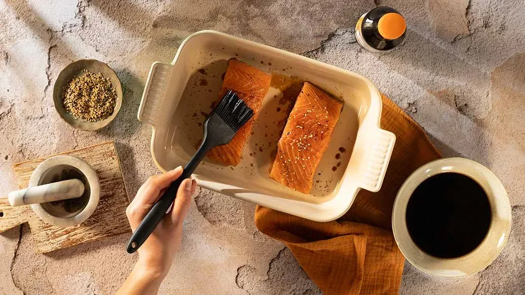 Préchauffer le four à 200°C (chaleur du haut et du bas). Dans un petit bol, mélanger la sauce Kikkoman avec l'huile de sésame Kikkoman et le miel.