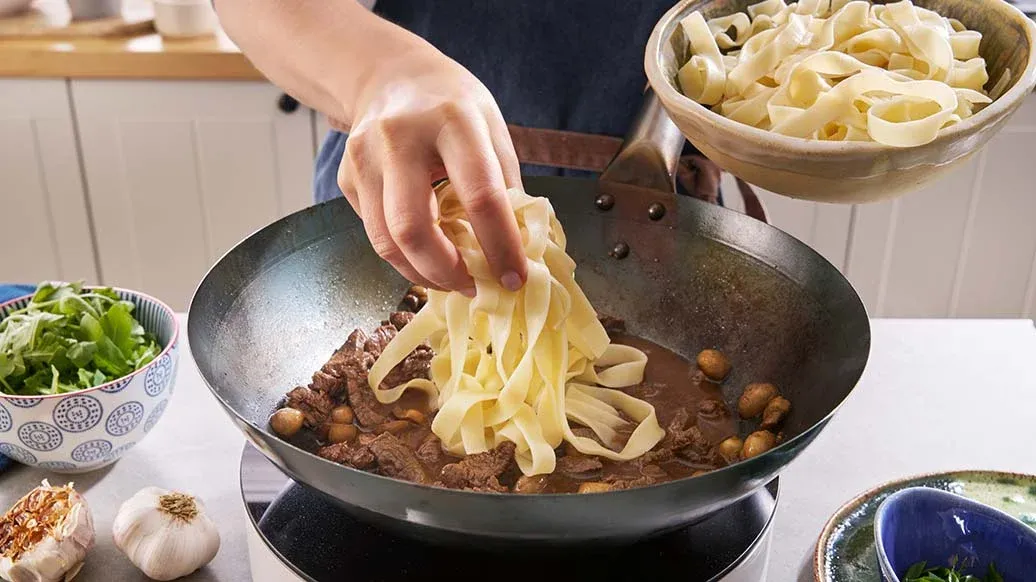 Un sauté riche et parfumé où la sauce soja Kikkoman sublime les saveurs du bœuf fondant, de l’ail rôti et des champignons de Paris, pour un équilibre parfait avec ses tagliatelles onctueuses.