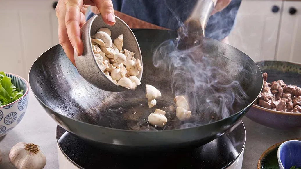 Ajouter un peu plus d'huile dans le même wok et faire revenir les champignons pendant 3 à 4 minutes jusqu'à ce qu'ils soient dorés.