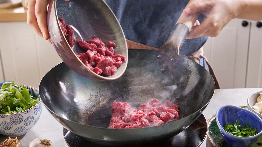 Faire chauffer un wok, ajouter l'huile et le bœuf et faire revenir pendant 2 à 3 minutes jusqu'à ce que la viande soit dorée. Retirer du wok et réserver.