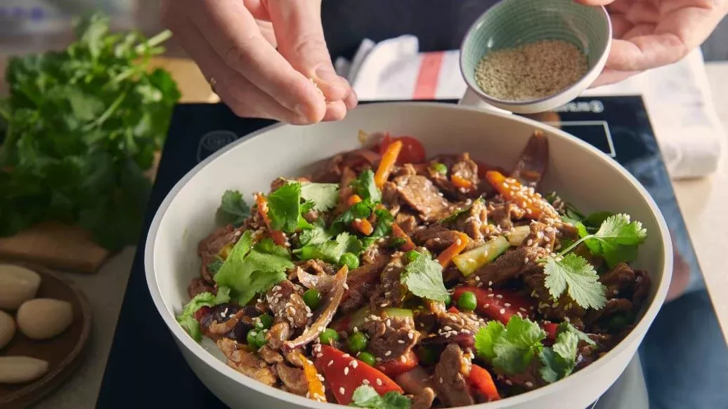 Chauffez l'huile dans une poêle. Ajoutez rapidement les aromates, l’un après l’autre : commencez par l'ail et le gingembre et faites sauter pendant 1 minute. Ajoutez l'oignon rouge et la carotte, et faites sauter pendant encore 1 minute. Ajoutez le bœuf tranché et faites sauter pendant 2-3 minutes. Ajoutez la sauce préparée à l’étape 2 et les légumes restants, y compris les petits pois. Bien mélanger. Servir avec de la coriandre et des graines de sésame.