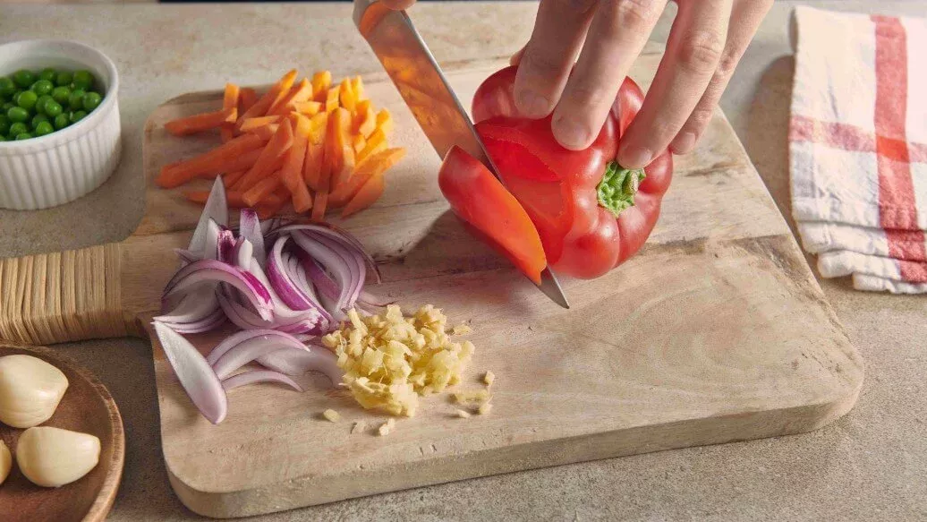 Hachez finement l'ail et le gingembre. Coupez le poivron rouge et la carotte en lanières. Coupez l'oignon rouge et le chou pak choï en morceaux un peu plus épais que les poivrons.