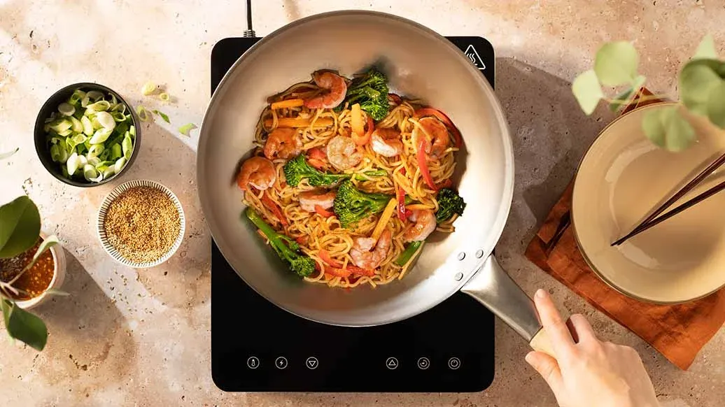 Un sauté de nouilles aux légumes croustillants et aux crevettes, dans une sauce qui combine sauce soja, huile de sésame et tahini. La combinaison parfaite de piment et de fraîcheur estivale, dans une recette rapide et facile.