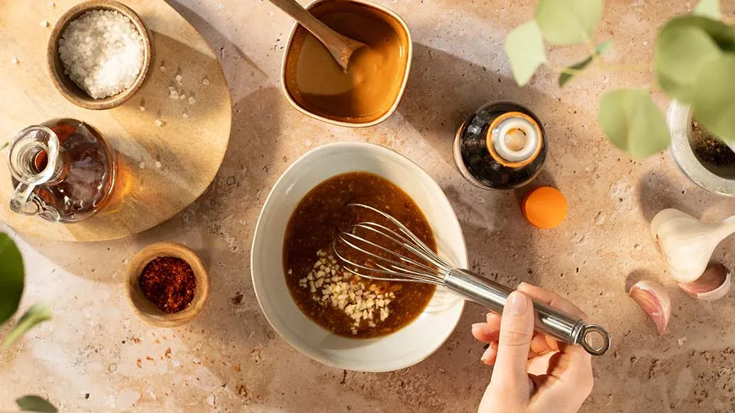 1 càs Huile de sésame grillée Kikkoman – 2 càs de tahini (pâte de sésame) – 1 càs Sauce soja sucrée Kikkoman – ¼ càc de flocons de piment – Sel et poivre
