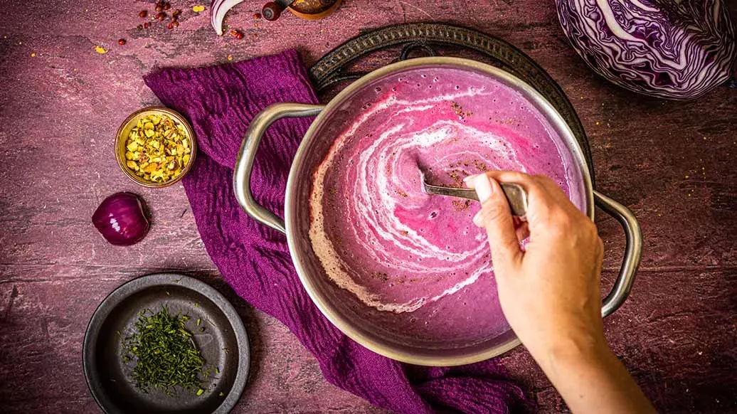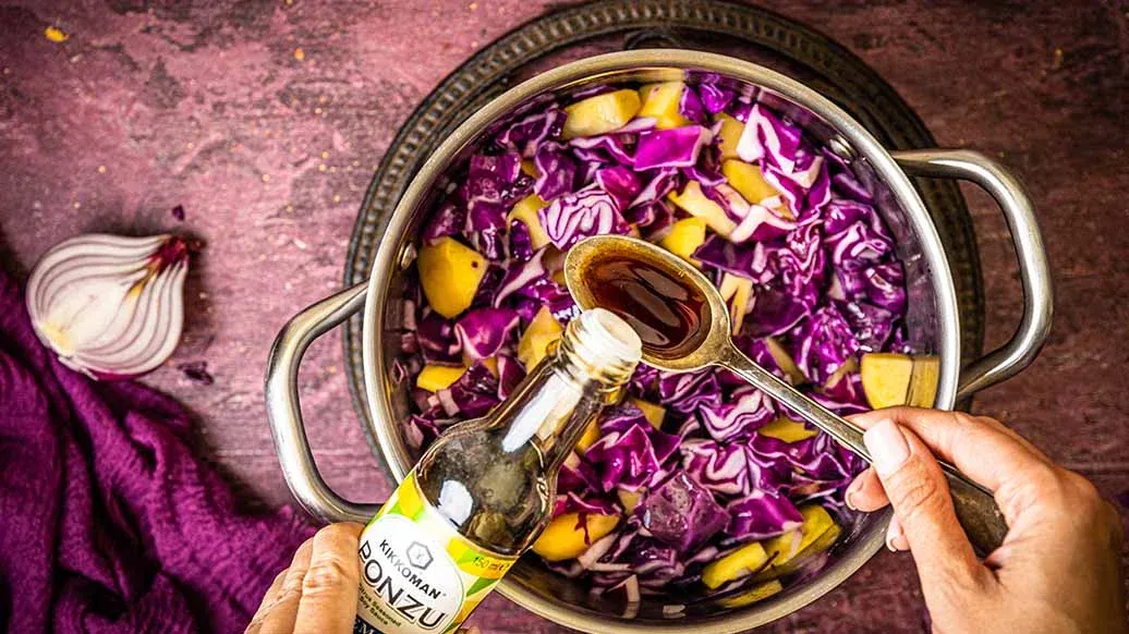 Apportez de la couleur à votre hiver avec une soupe au chou rouge. La rencontre du chou rouge dans une base de soupe à la pomme de terre, à l’ail et aux oignons rouges, parfumée avec la sauce soja citronnée Kikkoman Ponzu. Servir avec de l'aneth et un peu de crème pour encore plus de couleurs.