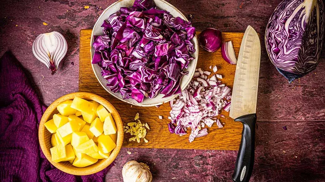 400 g de chou rouge – 300 g de pommes de terre – 1 oignon rouge – 2 gousses d’ail