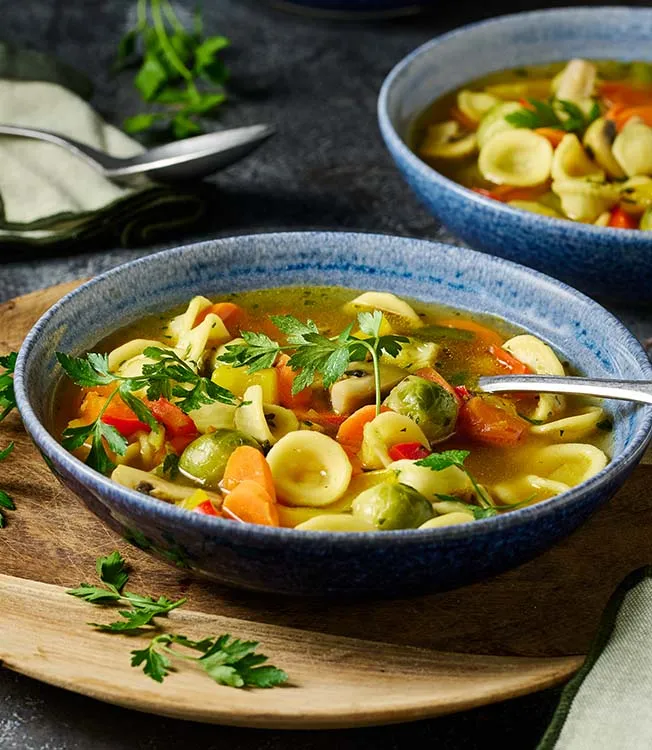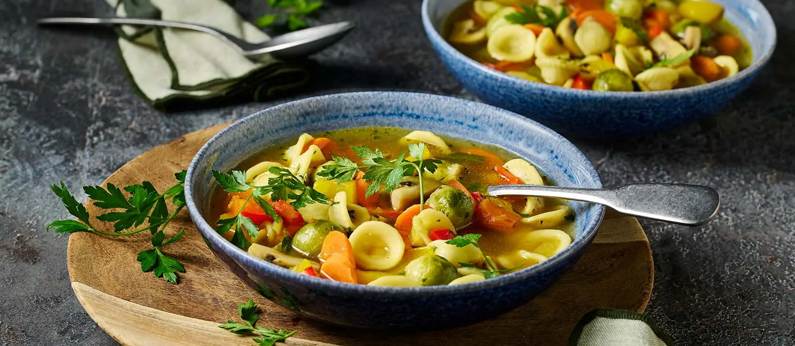 Faire chauffer un peu d’huile dans une casserole. Y faire revenir les oignons quelques minutes jusqu’à ce qu’ils soient translucides. Ajouter les légumes et faire revenir brièvement. Allonger ensuite avec le bouillon de légumes et laisser mijoter à feu moyen 15 minutes. Dans une autre casserole, faire cuire les pâtes dans un grand volume d’eau salée. Ajouter ensuite la Sauce Teriyaki au sésame grillé et poivrer à votre goût. Hacher finement le persil et l’incorporer. Pour finir, ajouter les pâtes à la soupe de légumes et servir.