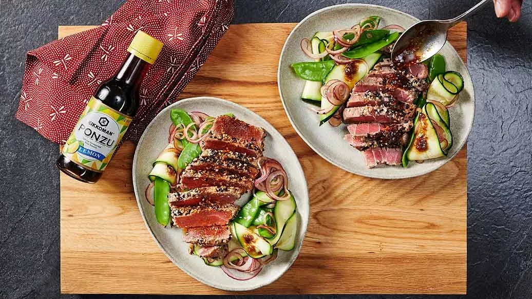 Préparer les légumes : éplucher les pois, les placer dans de l’eau bouillante pendant 4 minutes, égoutter, les passer brièvement sous l’eau froide et les mettre dans un saladier. Couper les petites courgettes en lanières fines et ajouter l’oignon rouge finement râpé. Verser 1 cuillère à soupe de Ponzu Sauce Soja citronnée sur les légumes, mélanger et mettre de côté. Mélanger les graines de sésame sur une assiette. Retirer le steak de thon de la marinade, laisser égoutter et tourner dans les graines de sésame. Mettre dans une poêle et faire cuir de chaque côté à feu vif pendant 1 minute. Retirer les steaks de la poêle, mettre la marinade et le reste de Ponzu Sauce Soja dans la poêle, faire cuire 2 minutes et retirer du feu. Couper les steaks en lanières d’environ 1 cm. Dresser : répartir les légumes sur les assiettes, y placer les lanières de thon et arroser avec la sauce chaude.