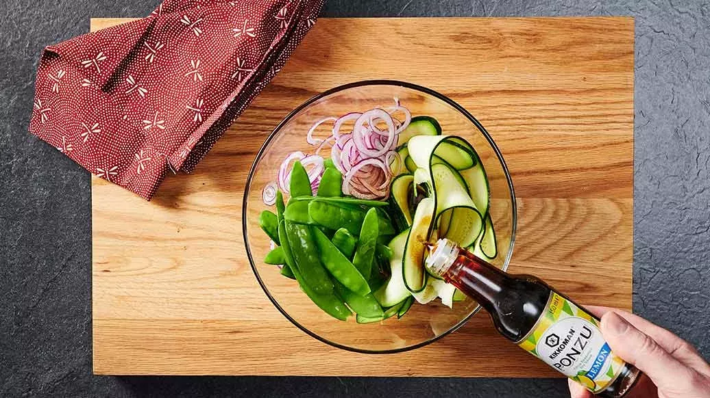 Plat d’accompagnement: 200 g de pois, 200 g de petites courgettes, 1 oignon rouge, 1 cuillère à soupe de Ponzu Sauce Soja citronnée Kikkoman.
