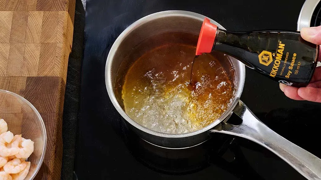 10 mangetout – Sel – 80 g de crevettes prêtes à cuire – 1 càs Sauce soja fermentation naturelle Kikkoman