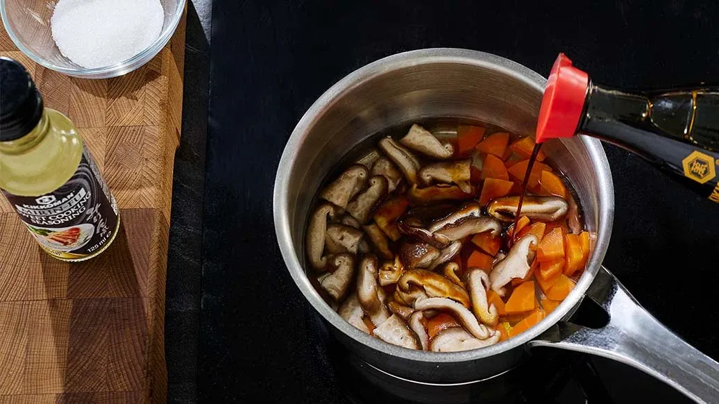 4 champignons shiitake – ¼ de carotte – 2 càs Sauce soja fermentation naturelle Kikkoman – 2 càs Assaisonnement de cuisine sucré de style Mirin Kikkoman – Sel – 1 càc de sucre – 1 càc de graines de sésame blanc