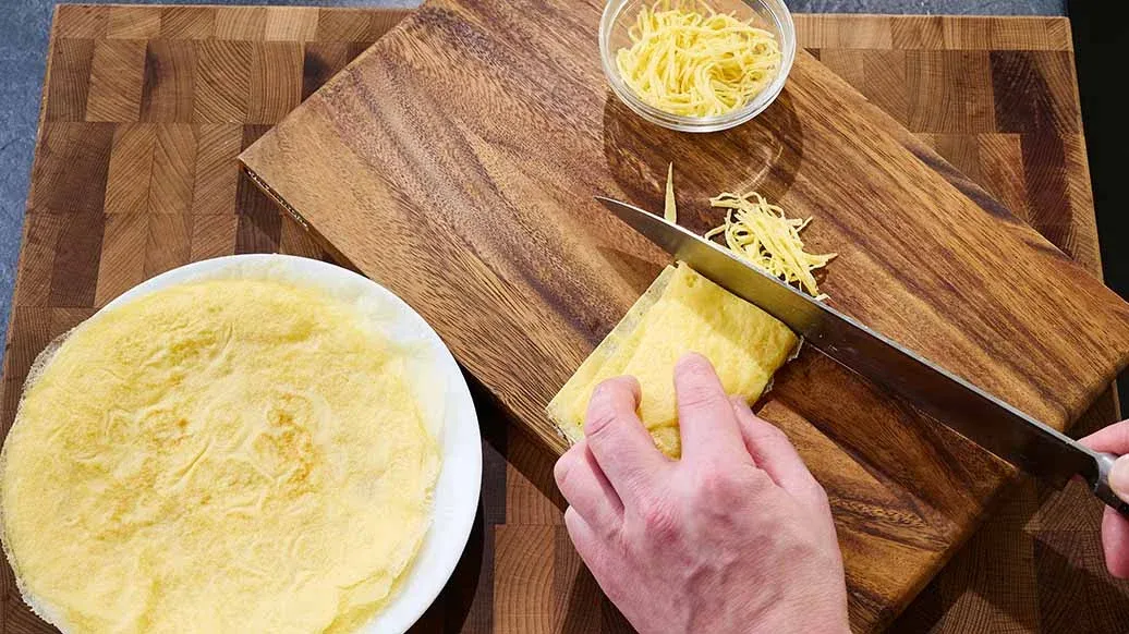 Préparer quatre omelettes fines à partir du mélange, laisser refroidir, puis couper en fines lamelles.