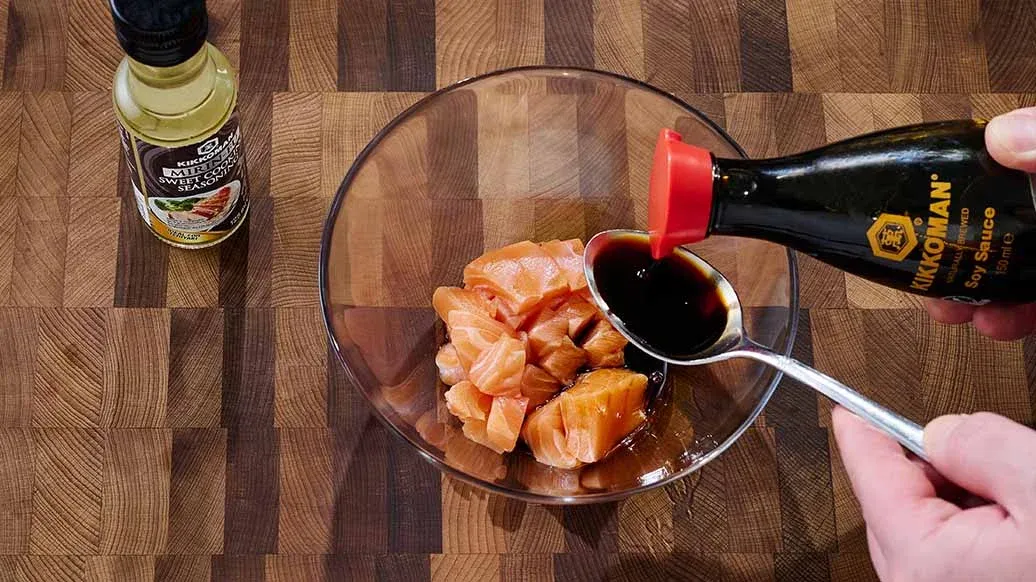 Couper le saumon en petits morceaux et le faire mariner pendant 15 minutes dans la sauce soja Kikkoman et l'assaisonnement doux au mirin Kikkoman. Couper l'avocat en dés.