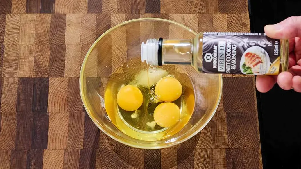 3 œufs – 1 càs Assaisonnement de cuisine sucré de style Mirin Kikkoman – 1 càc de sucre