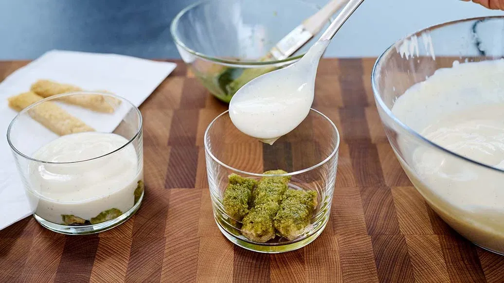 Une crème savoureuse à base de tofu soyeux et de yaourt au soja pour donner un nouveau souffle à ce grand classique. Le sirop au matcha relevé par la sauce soja sans gluten Kikkoman apporte une profondeur umami subtile et élégante à ce dessert vegan.