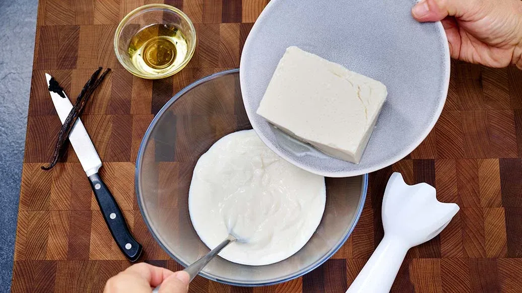 Couper la gousse de vanille dans le sens de la longueur et gratter les graines à l'aide d'un petit couteau bien aiguisé. Mixer le tofu soyeux avec le yaourt au soja, le sirop d'agave et les graines de vanille jusqu'à obtenir une texture lisse.