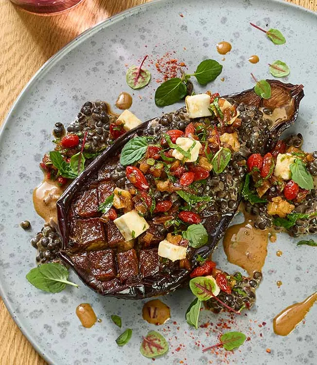 Aubergine fondante cuite au four, garnie de lentilles crémeuses au sésame, puis parsemer d’un mélange de baies de goji et de noix pour apporter du croquant. La sauce sésame Kikkoman et la sauce soja Kikkoman viennent parfaire l’ensemble.